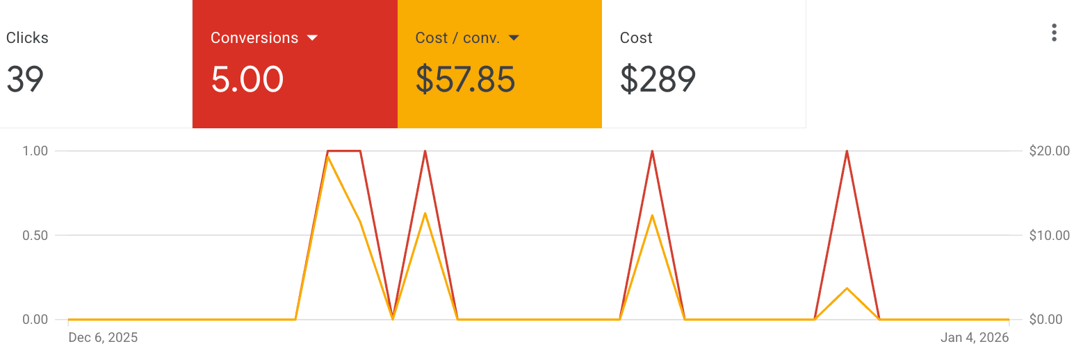 In the most recent 30-day period, the campaign generated 5 conversions from 39 clicks. Cost per conversion remained low at $57, with total ad spend of $289.